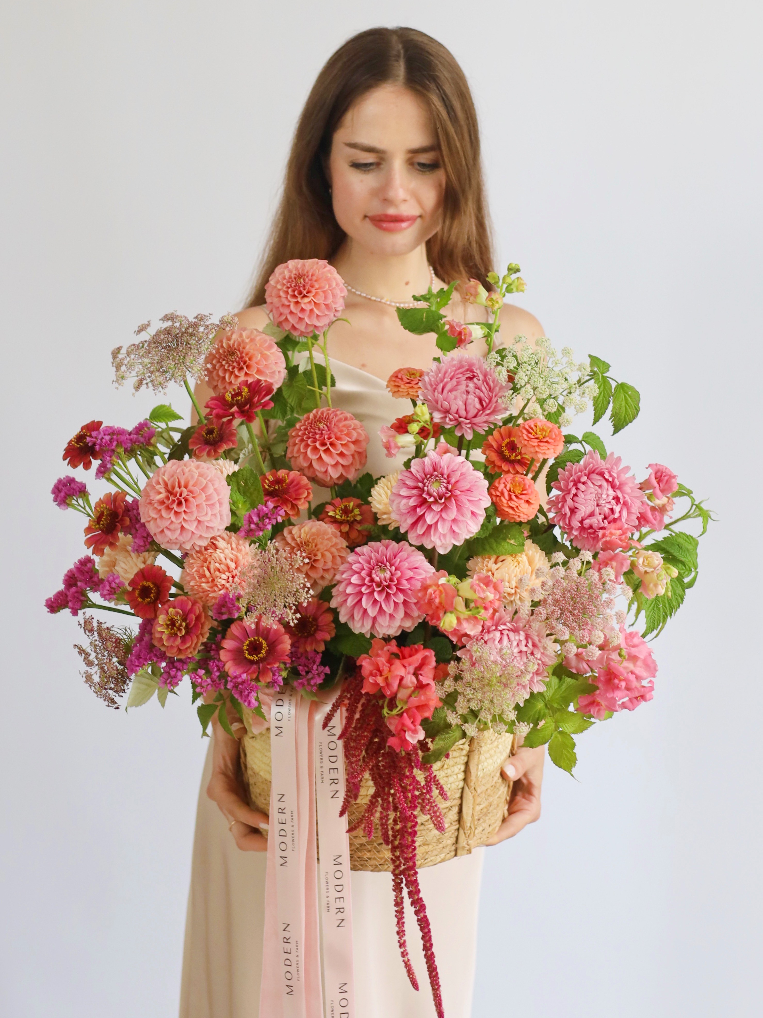 БОЛЬШАЯ КОРЗИНА С ГЕОРГИНАМИ, АМАРАНТОМ И ЦИННИЕЙ
