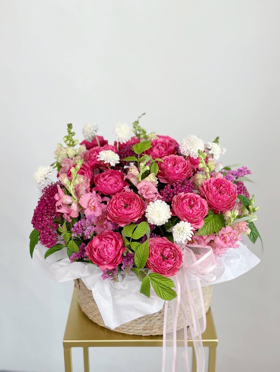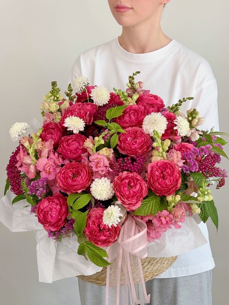 · Грандиозный формат — объемная корзина, наполненная роскошными цветами