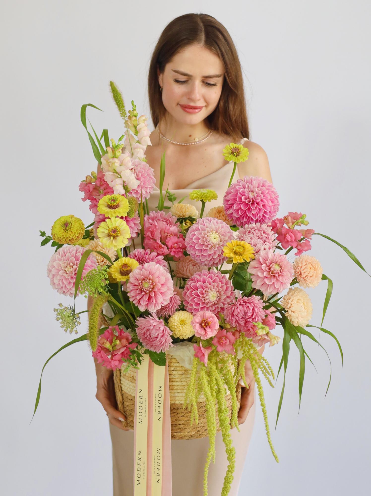 Представляем вашему вниманию впечатляющую цветочную композицию в элегантной корзине, где каждый цветок играет свою неповторимую роль в создании гармоничного ансамбля.
