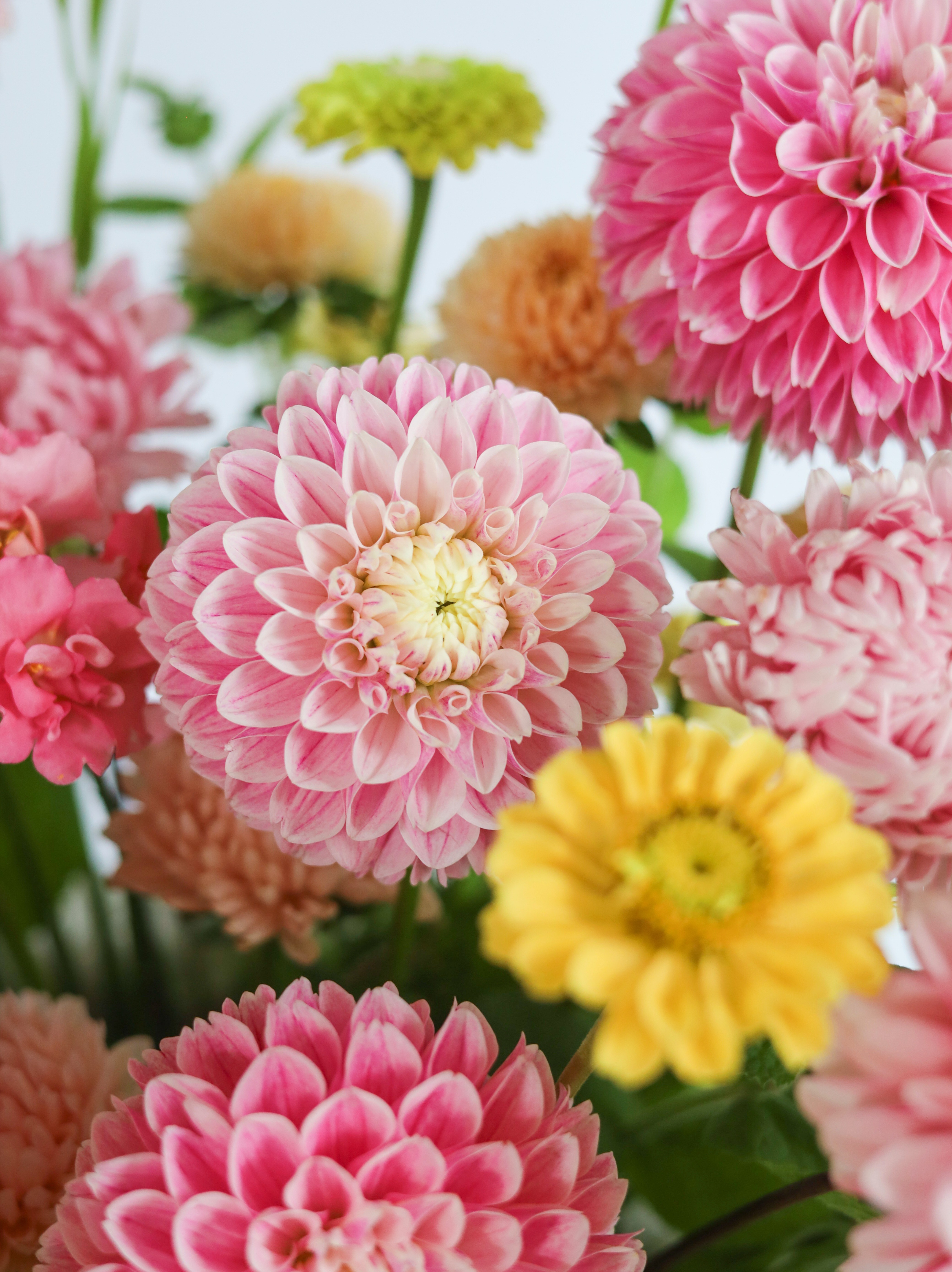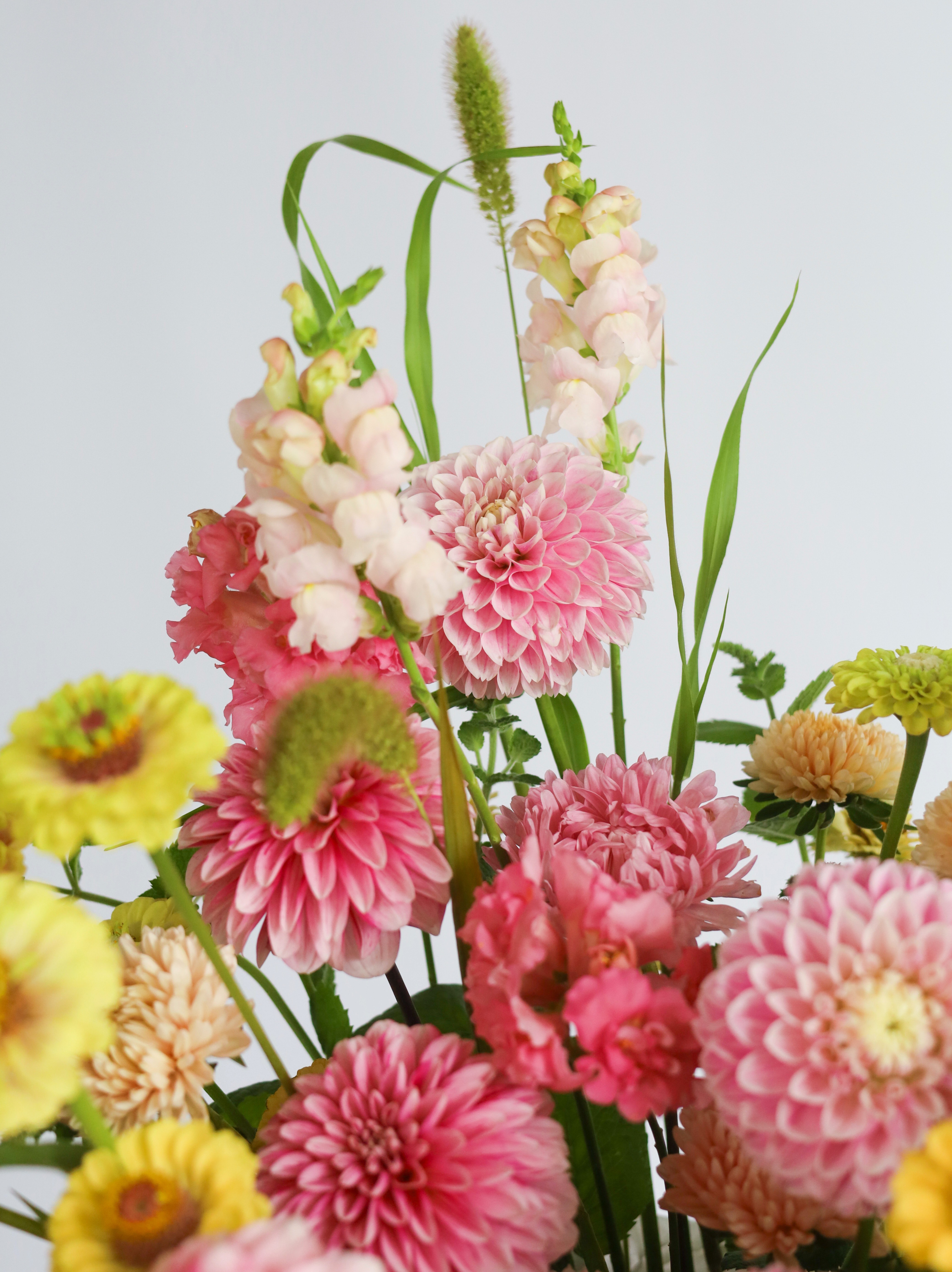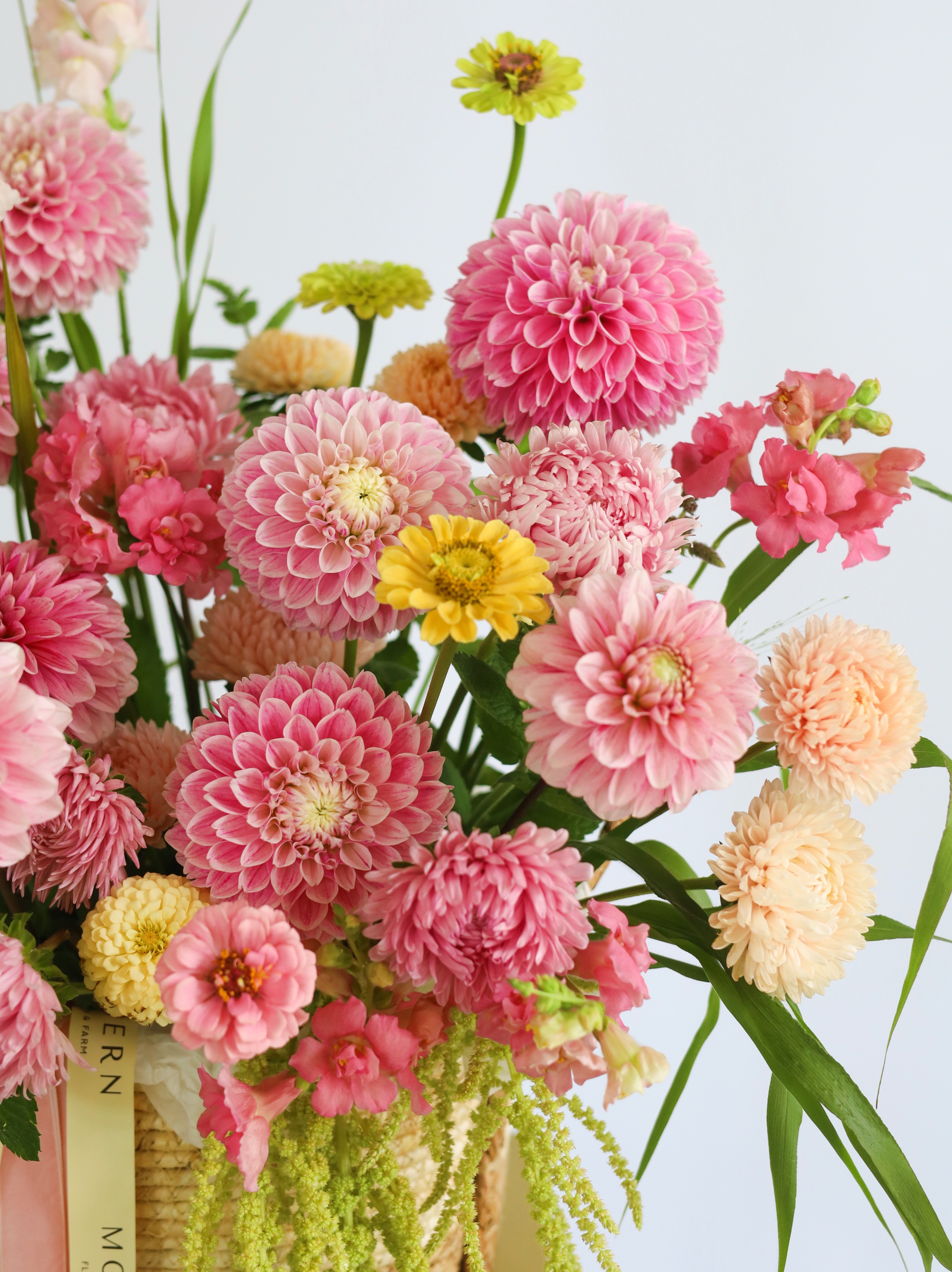 Цинния — яркий акцент композиции, привносящий в букет жизнерадостность и энергию своими насыщенными соцветиями.
