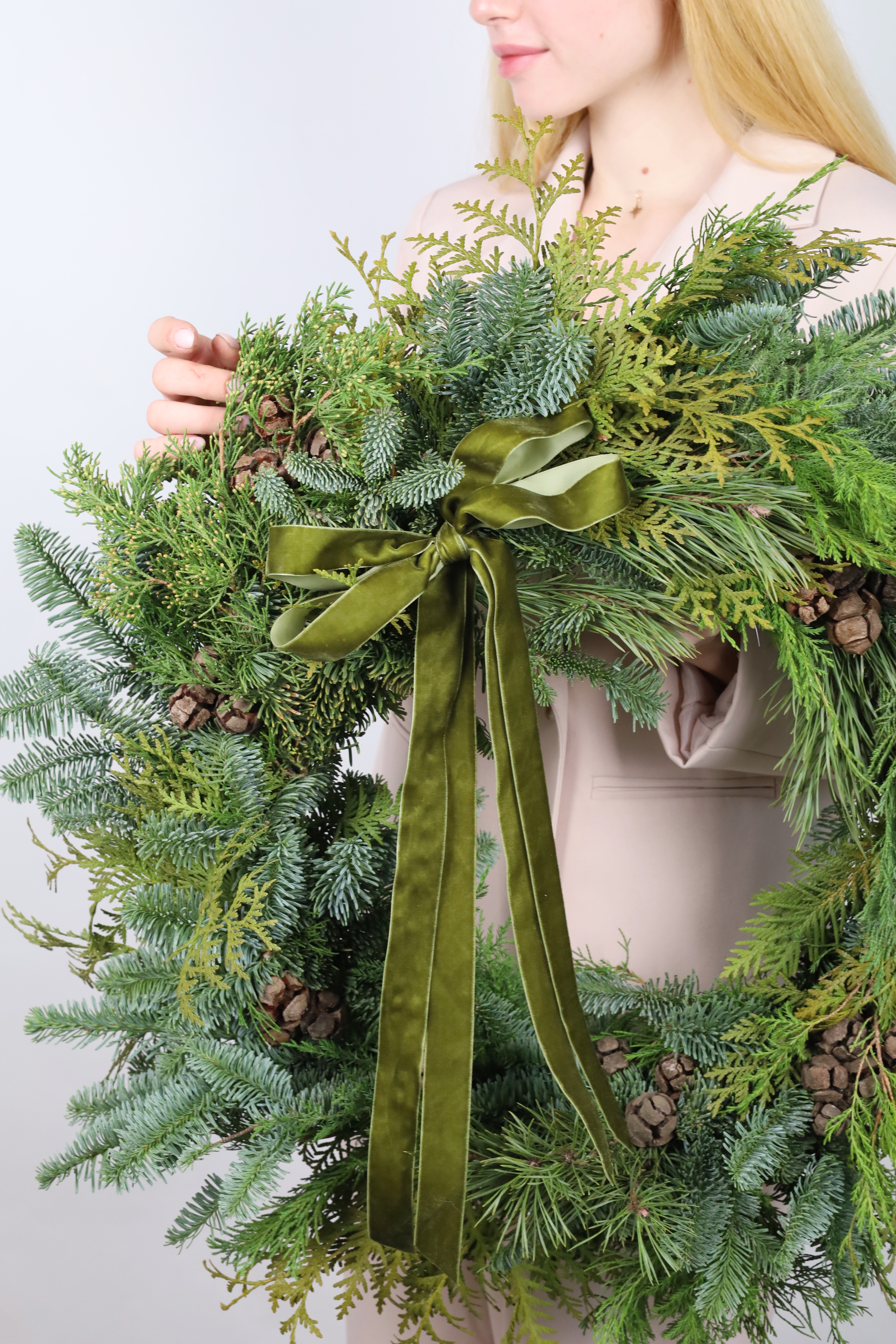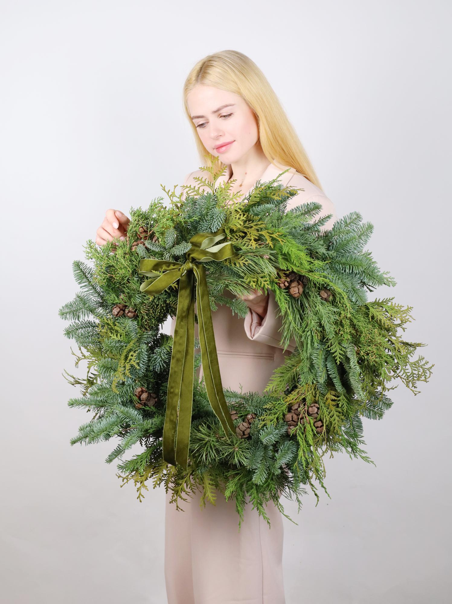 БОЛЬШОЙ ВЕНОК ИЗ МИКСА ХВОИ С КЕДРОВЫМИ ШИШКАМИ И БАРХАТНЫМ БАНТОМ