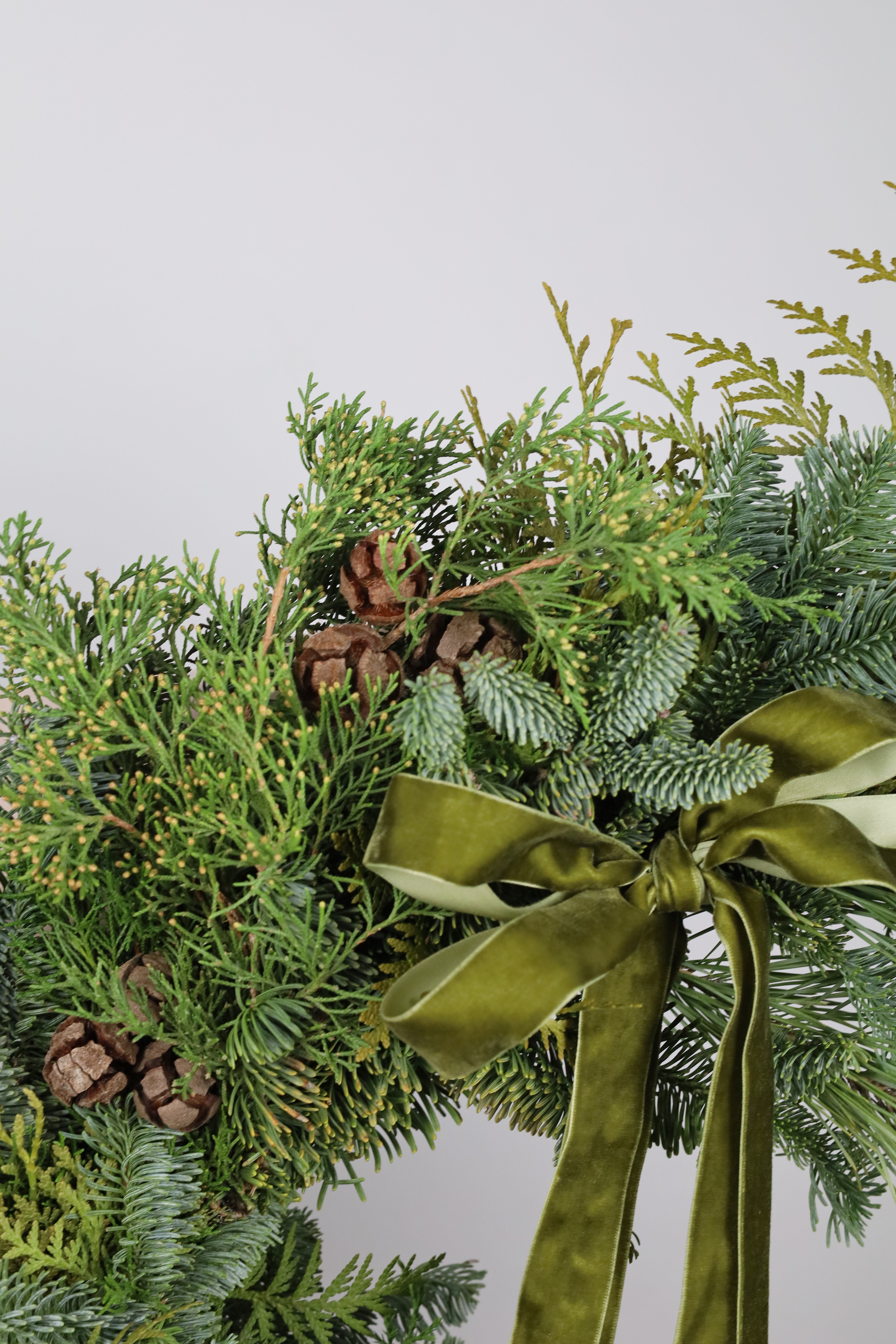 —БОЛЬШОЙ ВЕНОК ИЗ МИКСА ХВОИ С КЕДРОВЫМИ ШИШКАМИ И БАРХАТНЫМ БАНТОМ