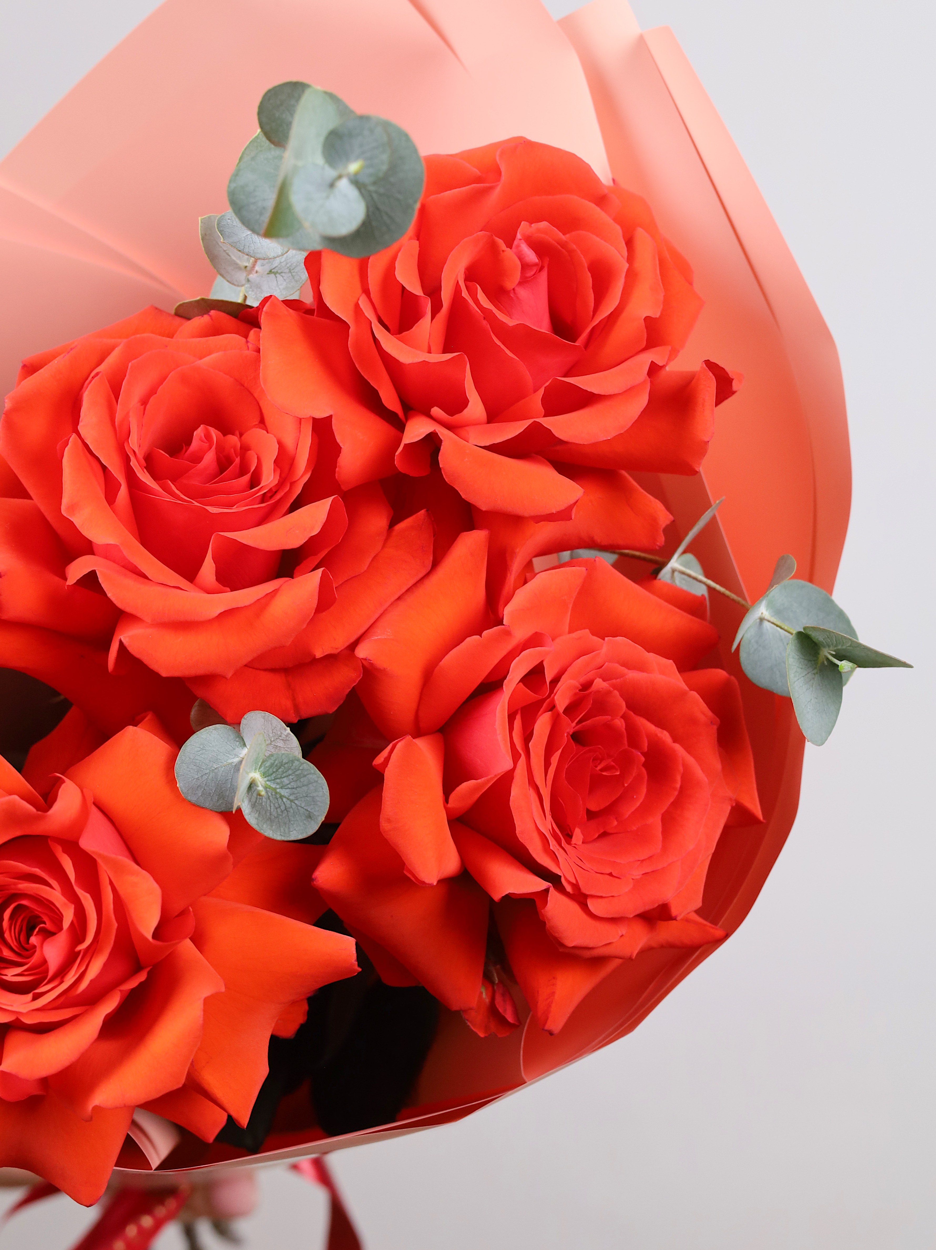 БУКЕТ ИЗ СТОЙКОЙ АЛОЙ ФРАНЦУЗСКОЙ РОЗЫ И ЭВКАЛИПТА