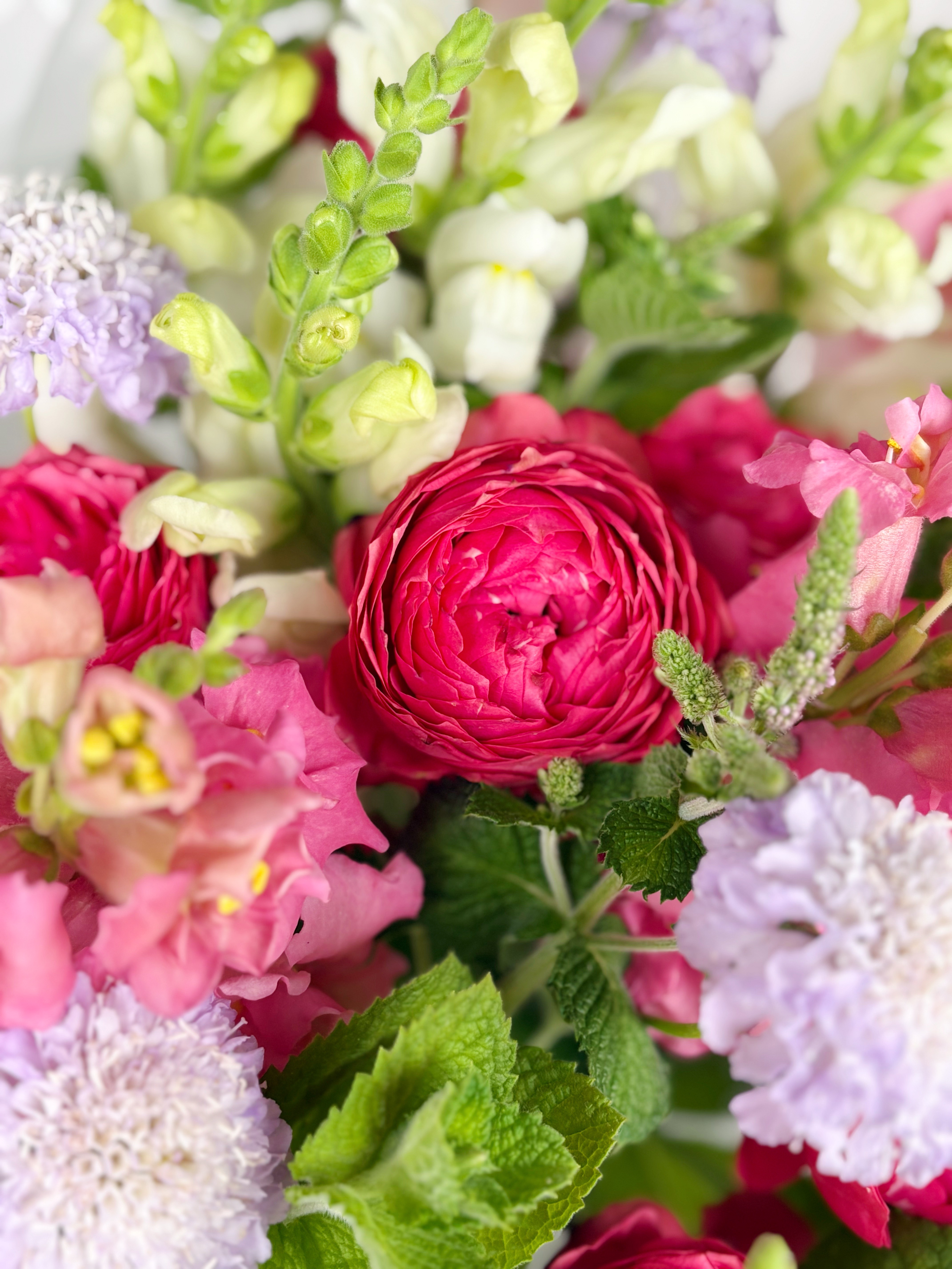 БУКЕТ С ПИОНОВИДНОЙ РОЗОЙ, СКАБИОЗОЙ И МЯТОЙ