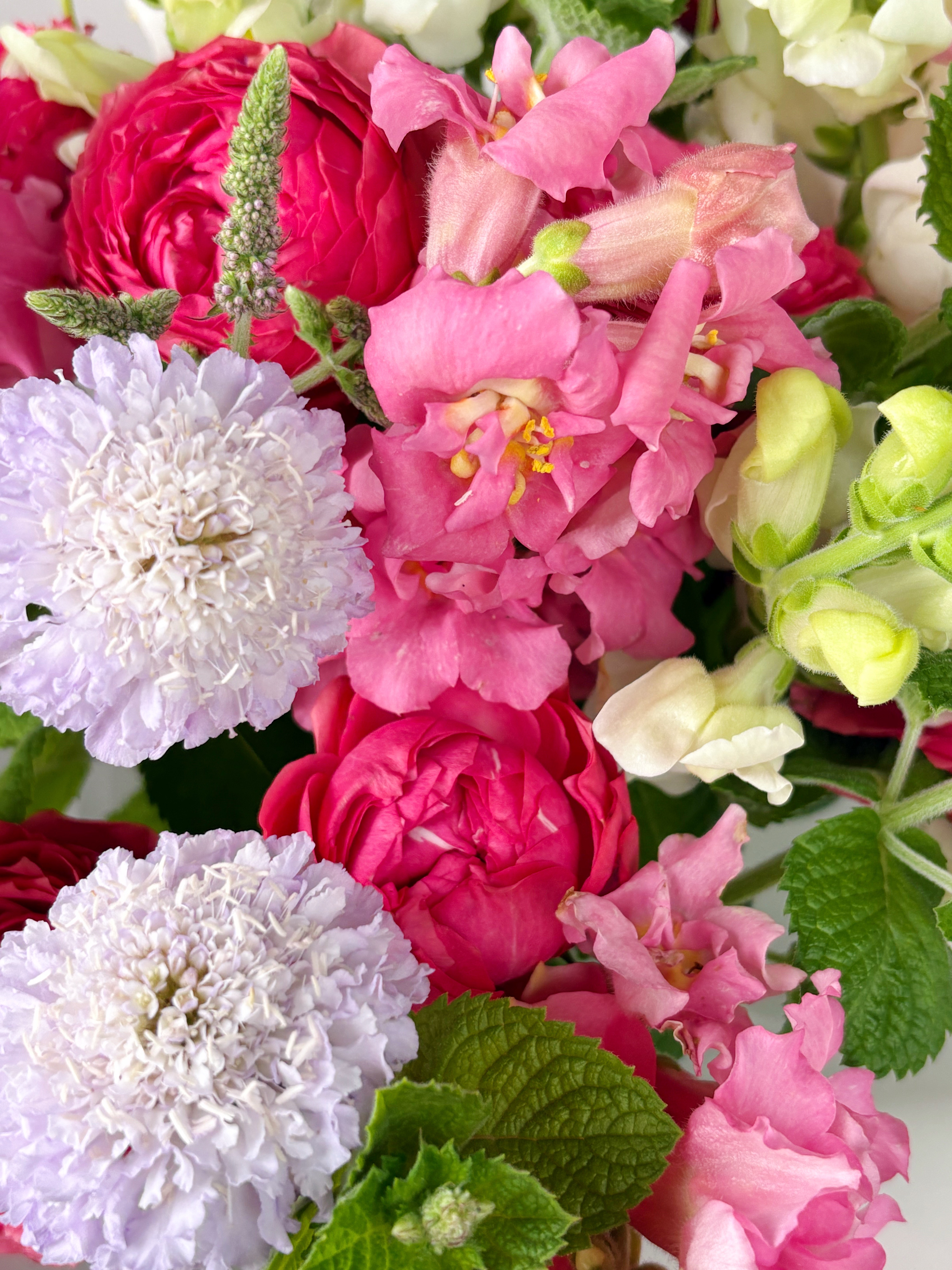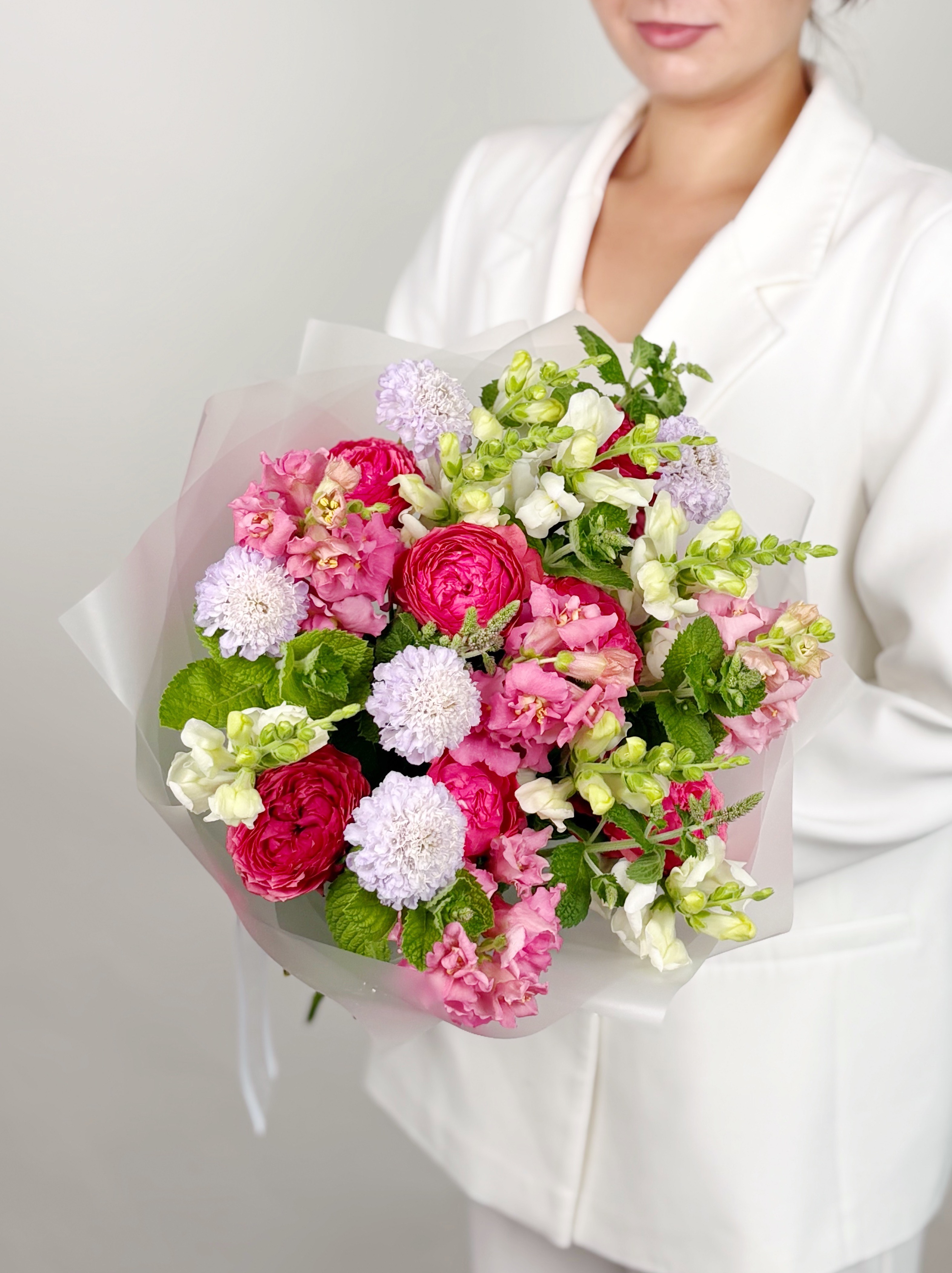 —БУКЕТ С ПИОНОВИДНОЙ РОЗОЙ, СКАБИОЗОЙ И МЯТОЙ