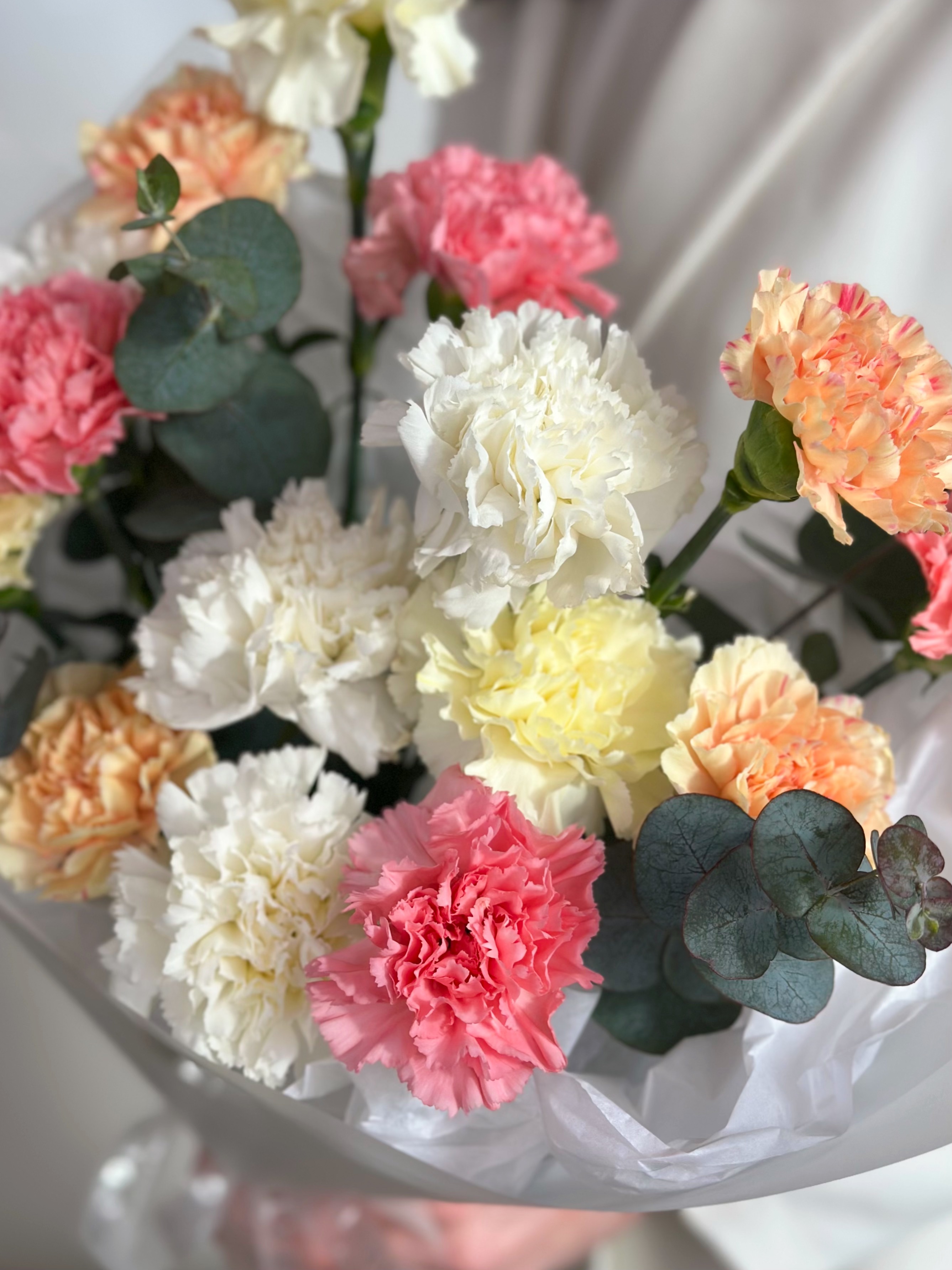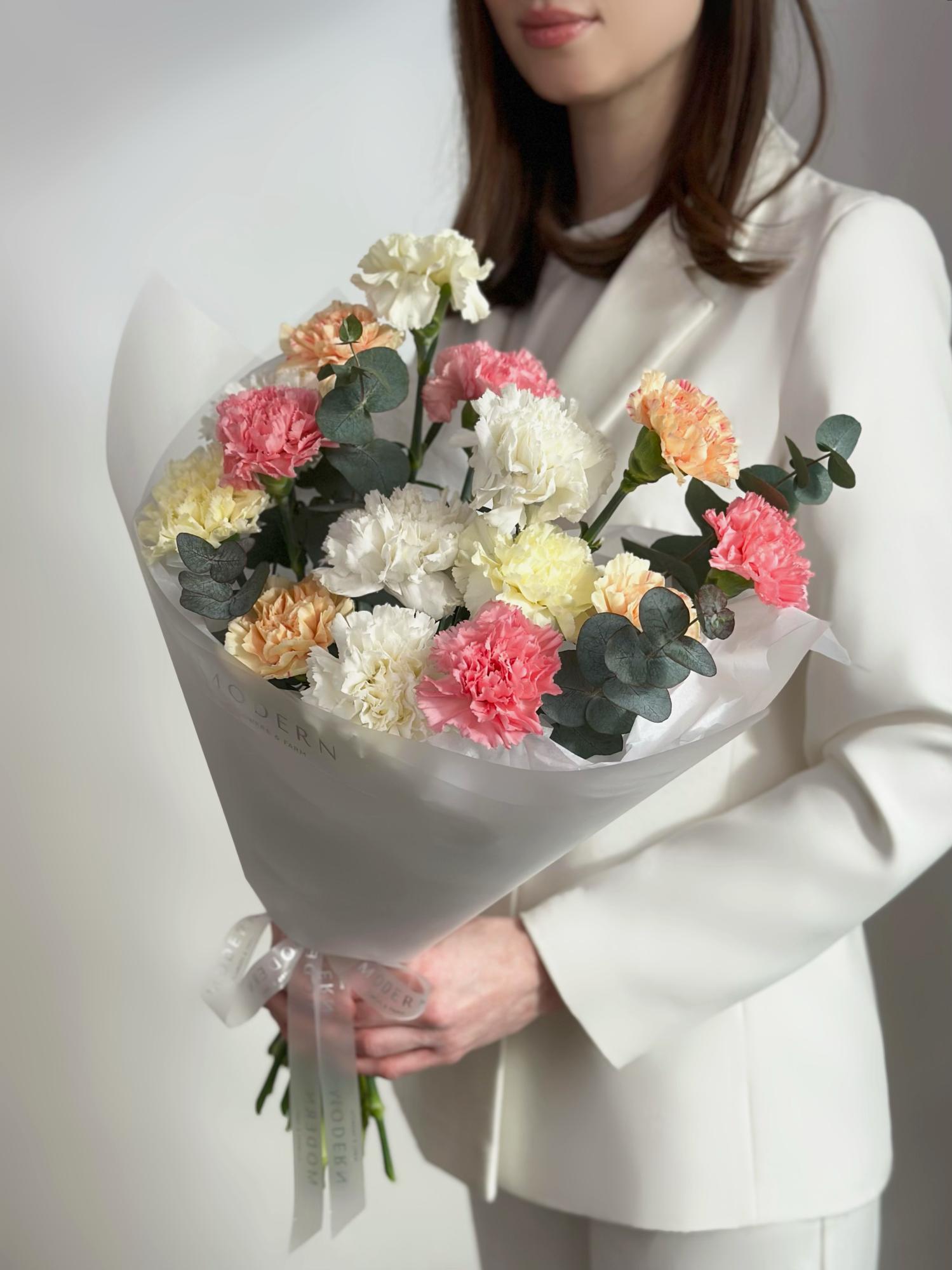 —БУКЕТ В ПАСТЕЛЬНЫХ ОТТЕНКАХ ИЗ ГВОЗДИКИ И ЭВКАЛИПТА