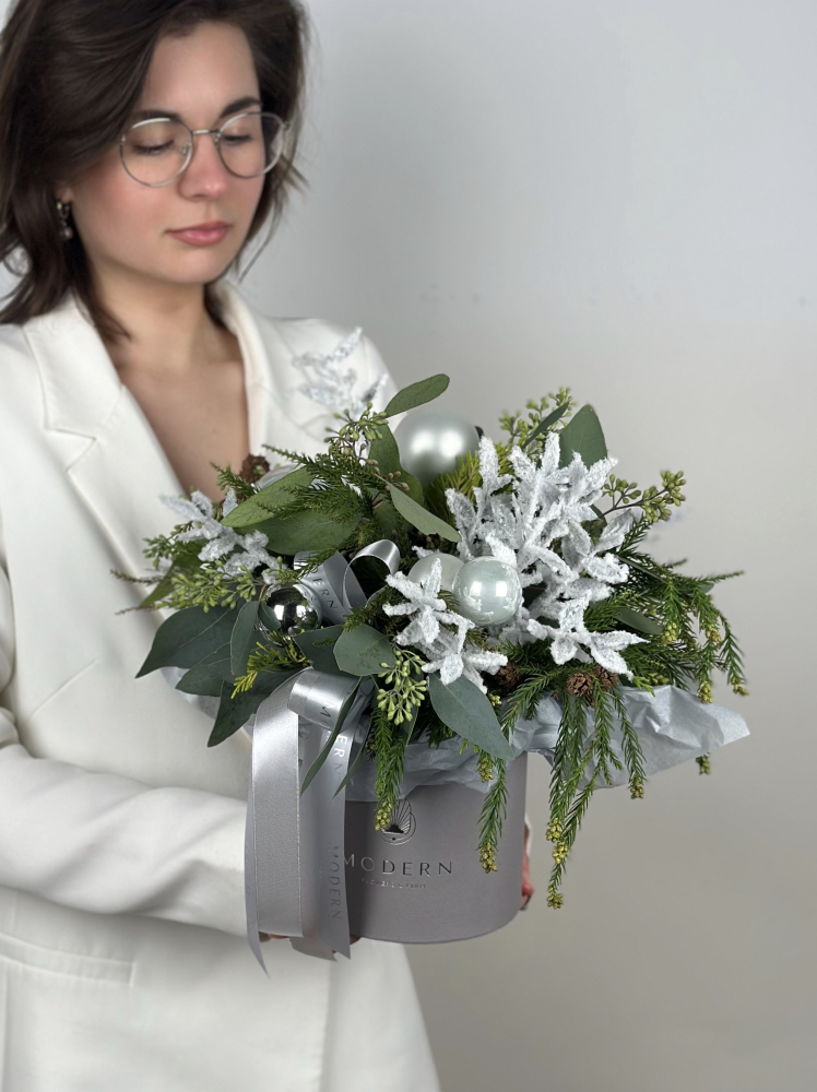 КОМПОЗИЦИЯ ИЗ ХВОИ И ЭВКАЛИПТА В ШЛЯПНОЙ КОРОБКЕ