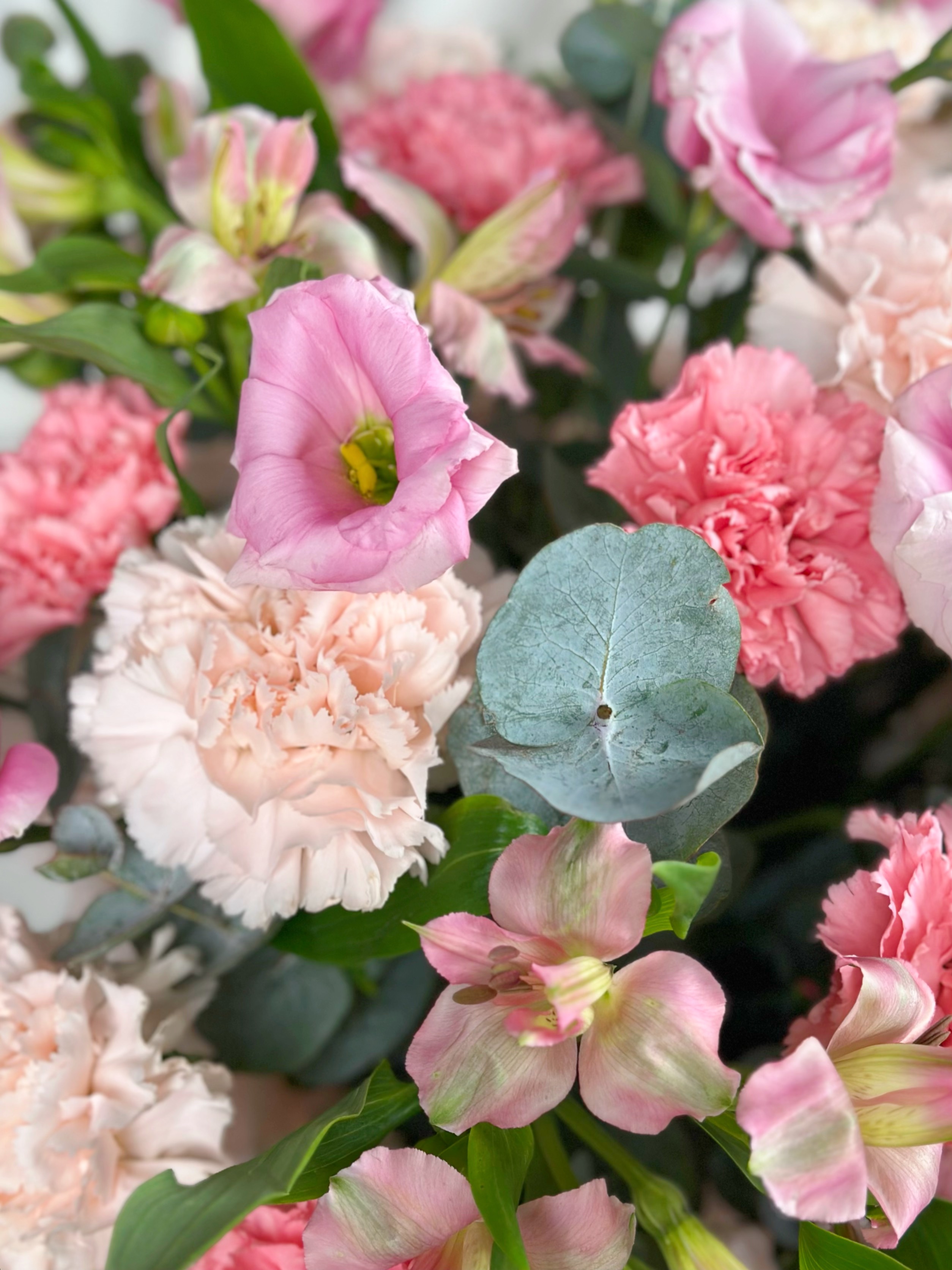 КОРЗИНА С ЭУСТОМОЙ, АЛЬСТРОМЕРИЕЙ И ГВОЗДИКОЙ