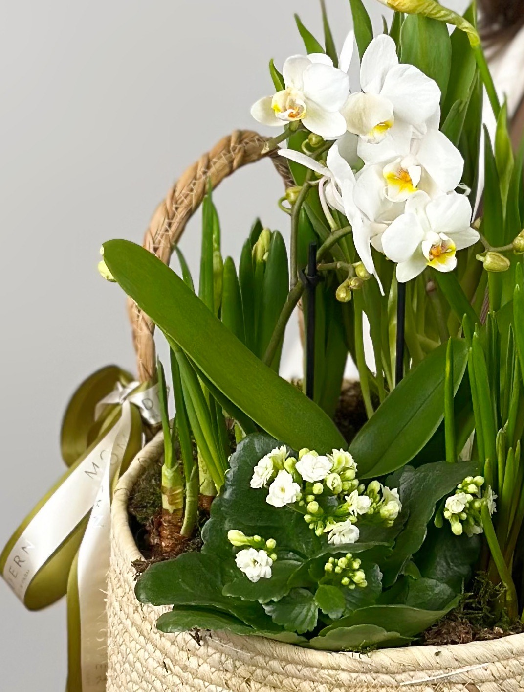 КОРЗИНА С ЛУКОВИЧНЫМИ ВЕСЕННИМИ ЦВЕТАМИ И ОРХИДЕЕЙ №21