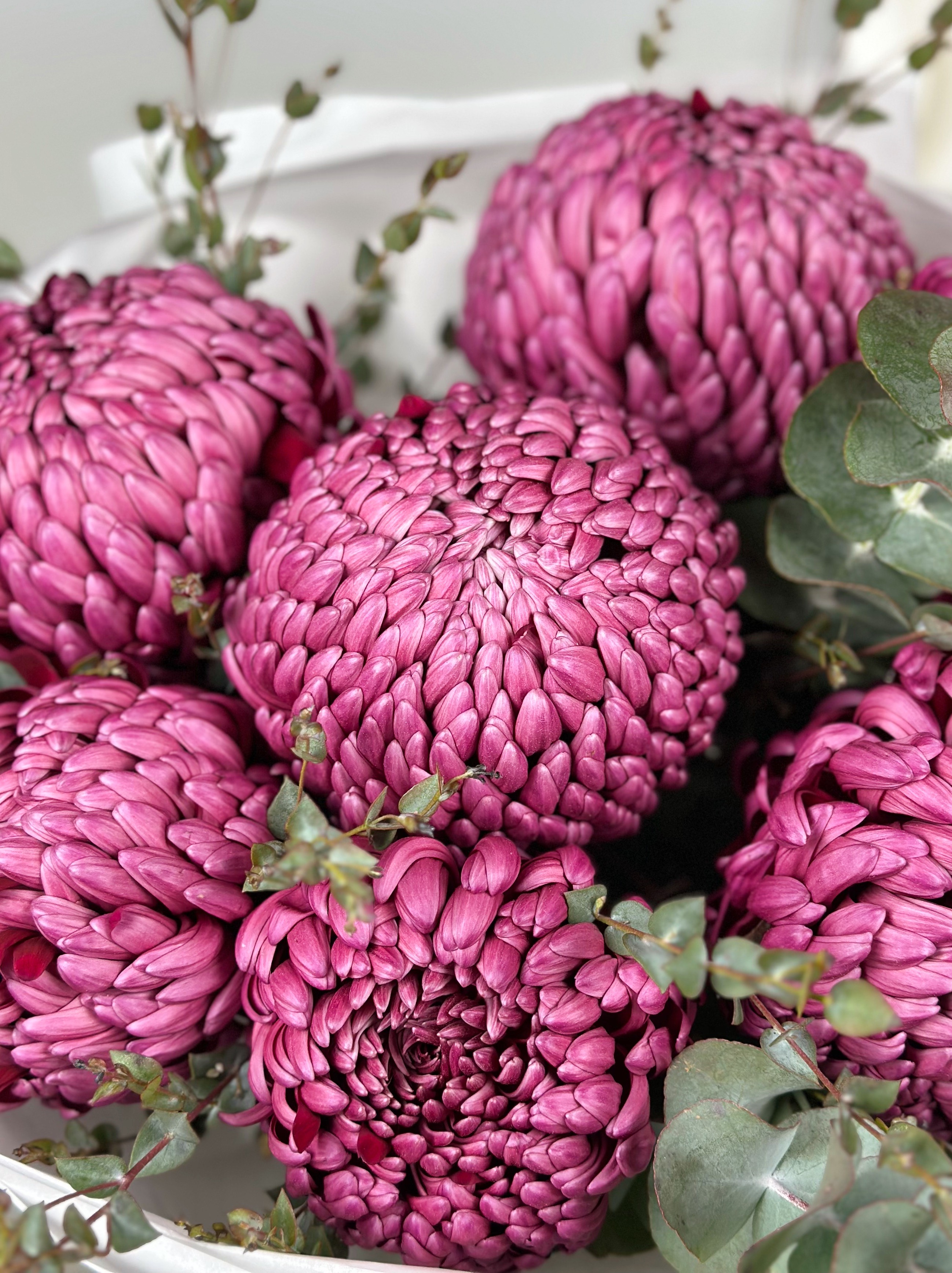 —КРУГЛЫЙ БУКЕТ С ХРИЗАНТЕМОЙ И ЭВКАЛИПТОМ