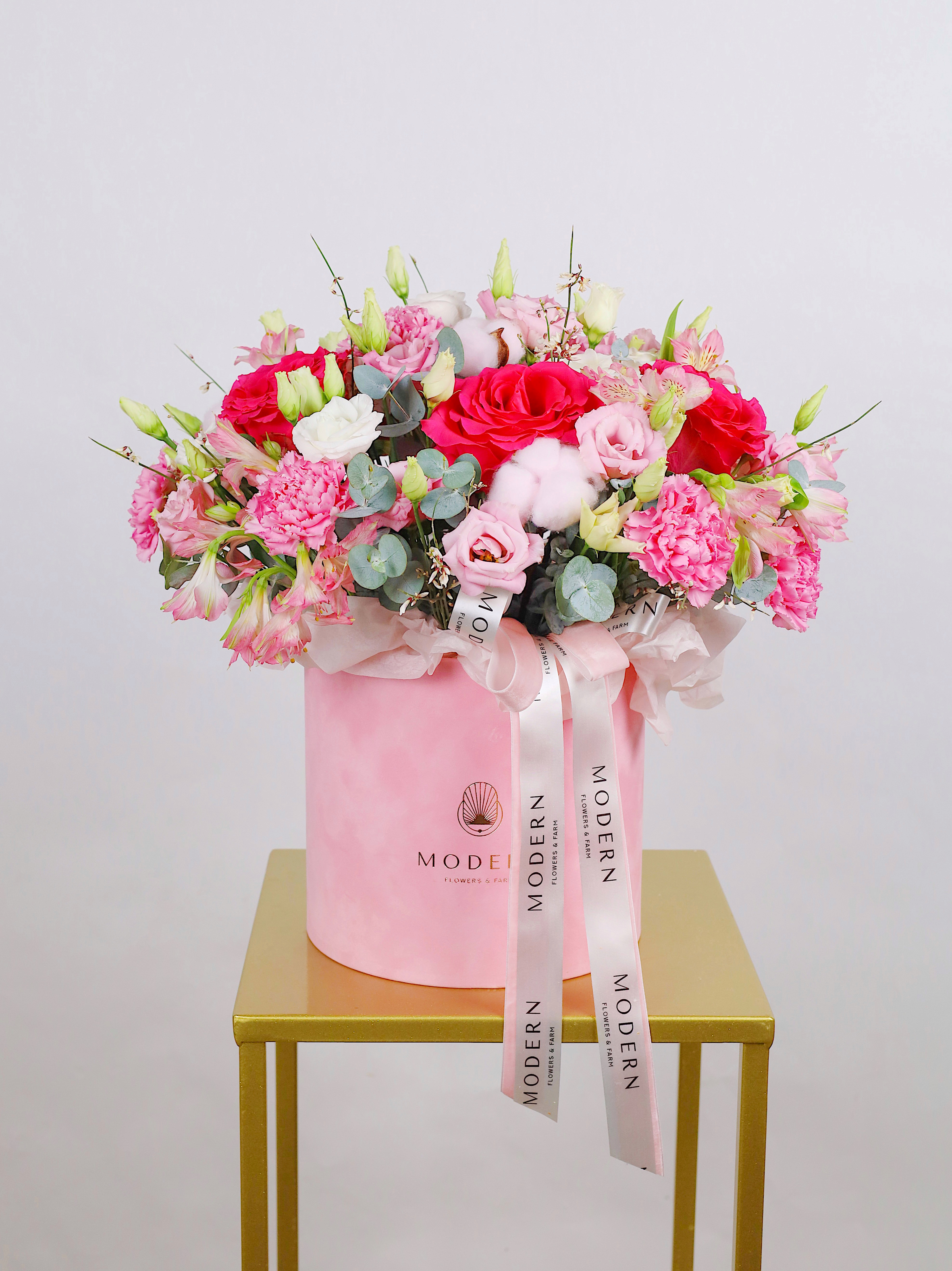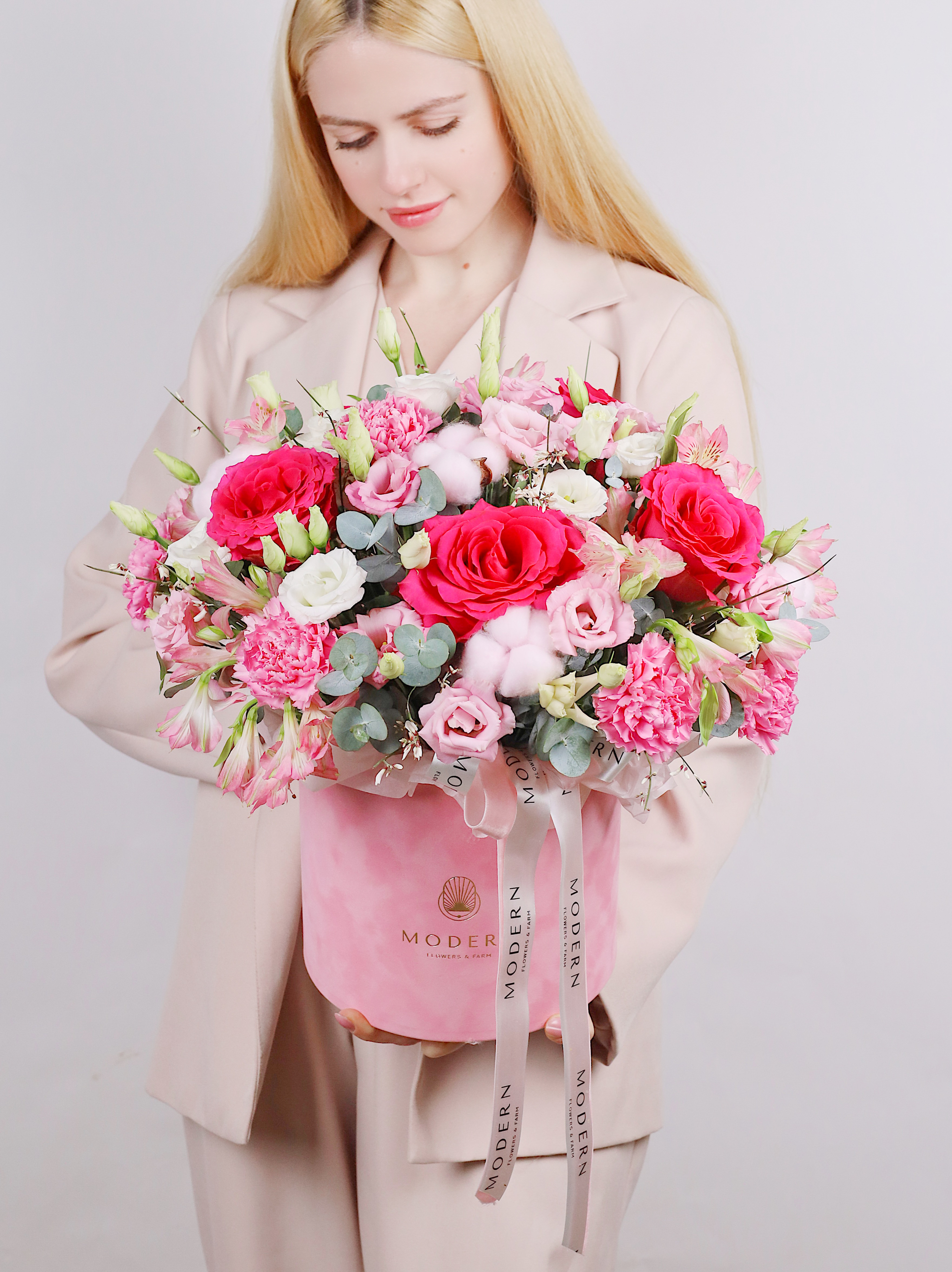 —ПИОНОВИДНАЯ РОЗА, ЭУСТОМА, АЛЬСТРОМЕРИЯ В БАРХАТНОЙ ШЛЯПНОЙ КОРОБКЕ