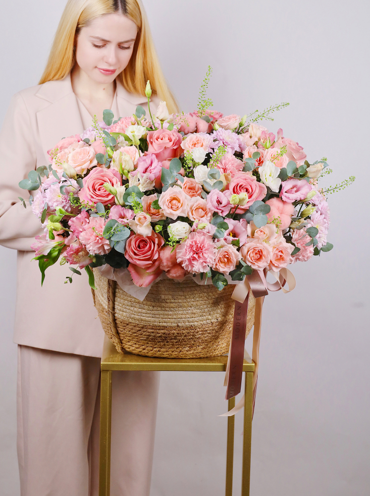 ПИОНОВИДНАЯ РОЗА, ЭУСТОМА, ЭВКАЛИПТ В ПЛЕТЕНОЙ КОРЗИНЕ