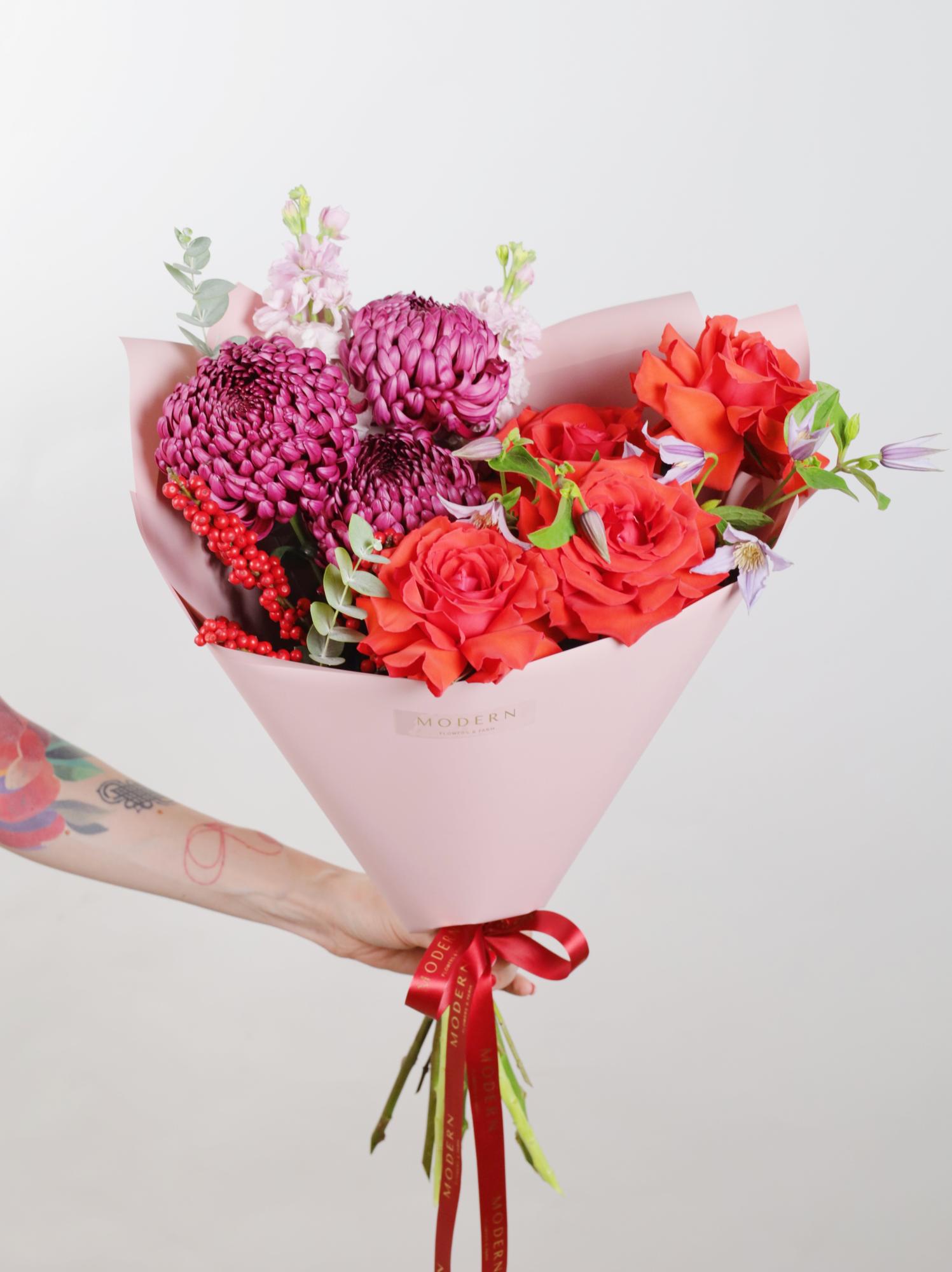 —ЯРКИЙ БУКЕТ С ХРИЗАНТЕМОЙ, ИЛЕКСОМ И ФРАНЦУЗСКОЙ РОЗОЙ
